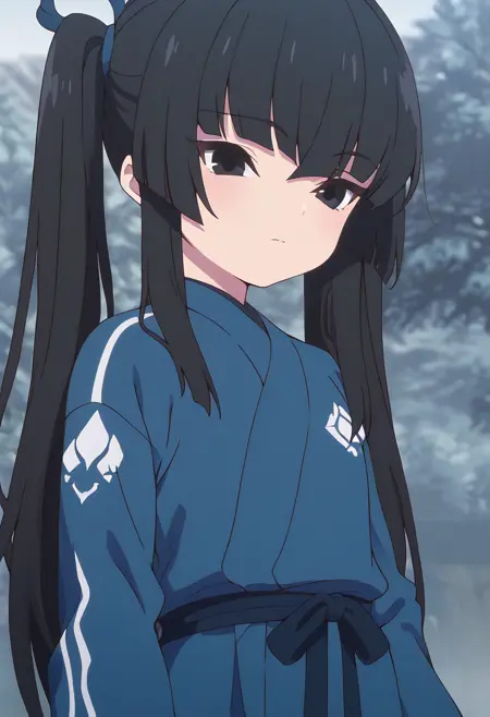 yui: yui, 1girl, 갈색 머리카락, 매우 긴 머리카락, 머리 리본, 아호게, 옆머리, 갈색 눈, 파란 기모노, 오비, 띠, 넓은 소매, 긴 소매