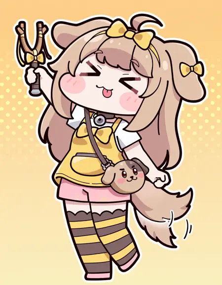 休闲装:休闲装、黄色蝴蝶结、发带、黄色颈铃、白衬衫、短袖、黄色背心、狗形斜挎包、手链、粉色短裤、条纹长筒袜、粉色鞋履