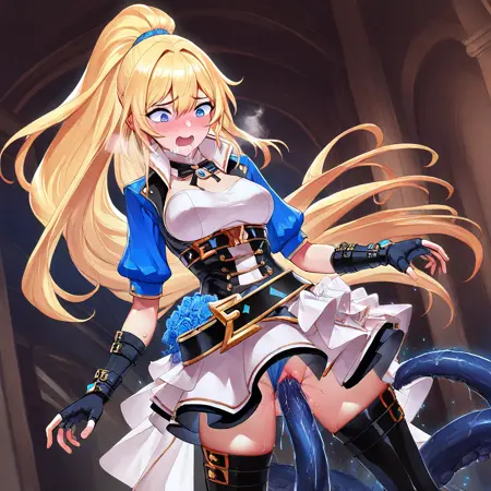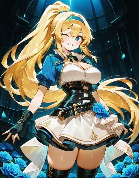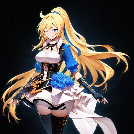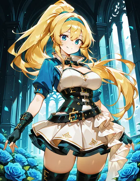 1girl, solo, EzraFrontierHunter, blonde hair, blue eyes, blue hairband, ponytail, very long hair, white collar, detached collar, black bow with gold trim, popped white collar with gold trim, blue cropped jacket, short sleeves, white top, black corset, black belts with gold trim, blue roses, white waist cloth, gold and blue gem, white puffy skirt with gold trim, black puffy underskirt, layered skirt, black thighboots with belts, black gloves with belts, fingerless gloves