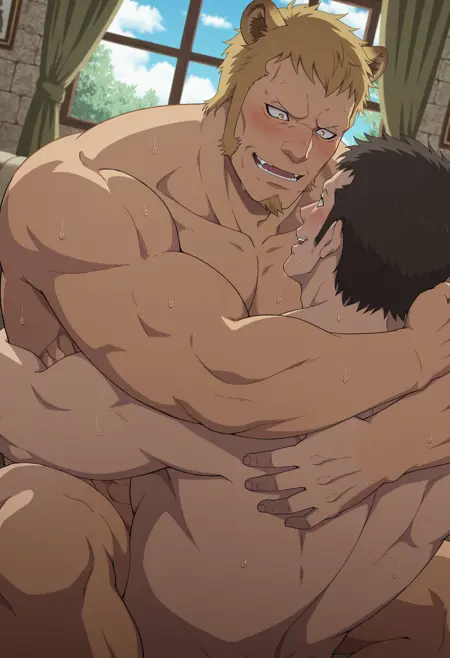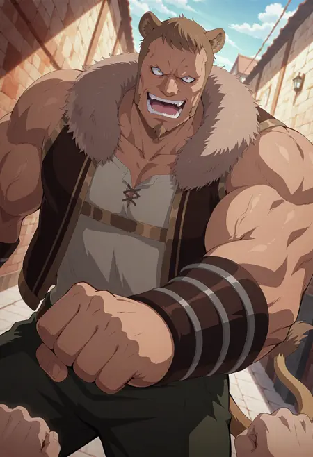 lion ears, no eyebrow, yellow eyes, small goatee, thick sideburn, white tanktop, brown wristbands with stripes