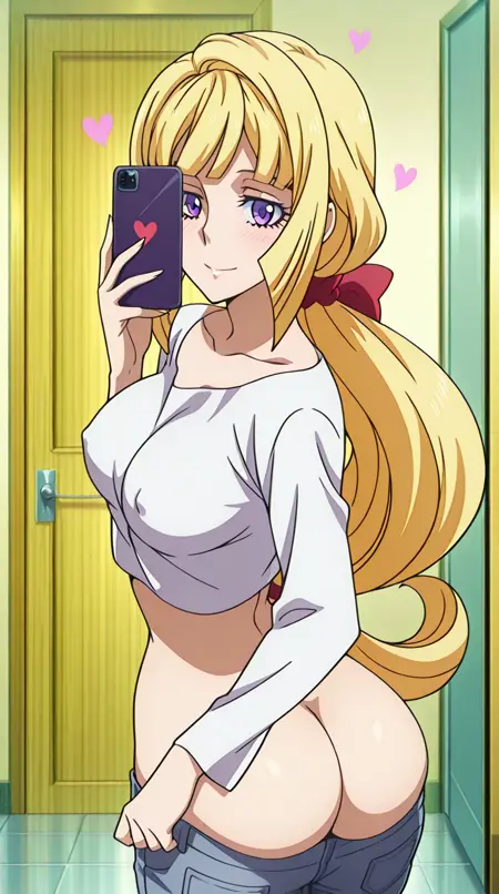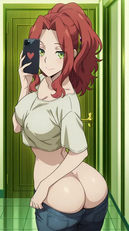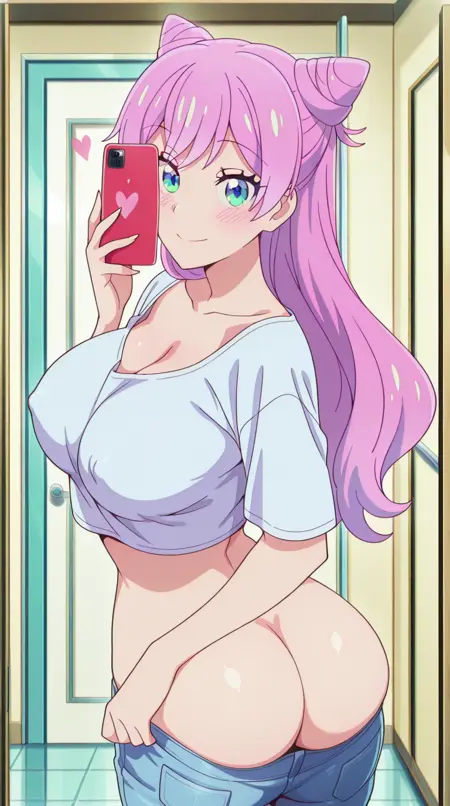 lora:random-nsfw-poses-v1-illustriousxl-lora-nochekaiser:1, 랜덤 NSFW 포즈, 솔로, 시청자 바라보기, 얼굴 붉힘, 미소, 셔츠, 들고 있는, 닫힌 입, 서 있는, 가려진 유두, 잠금뼈, 엉덩이, 심장, 컨트리 쇼트, 바지, 실내, 뒤에서 본 시선, 크롭 탑, 브라 없음, 팬티 없음, 휴대폰, 옷을 끌어당기는 행위, 휴대전화, 청바지, 휴대폰 들고 있는, 청바지, 엉덩이 틈, 타일, 문, 셀피, 스스로 끌어당기는, 바지 끌어당기기, 몸을 비틀고 있는,
