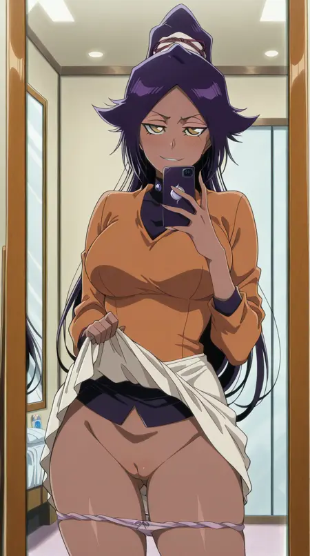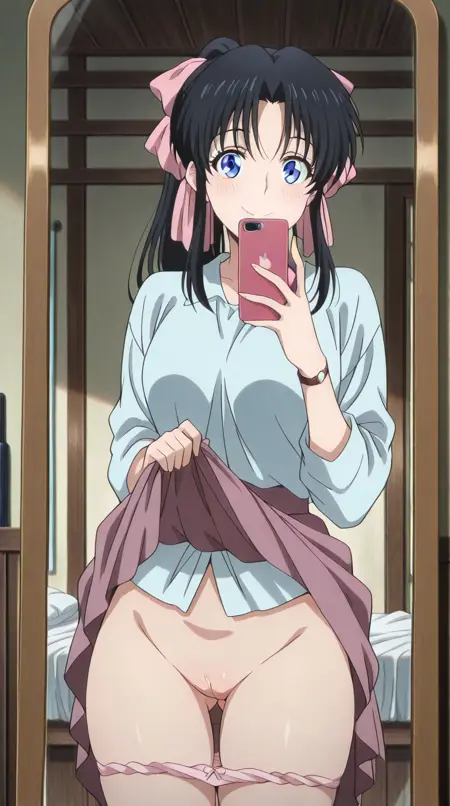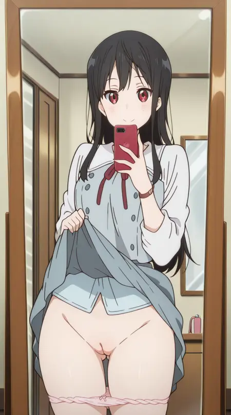 lora:random-nsfw-poses-v1-illustriousxl-lora-nochekaiser:1, 随机成人姿势,单人,注视观众,脸红,微笑,上衣,手持,闭嘴,站立,遮盖乳头,锁骨,臀部,心形,牛仔镜头,裤子,室内,从背后,露脐装,无胸罩,无内裤,手机,拉扯衣物,手机,牛仔布,智能手机,手持手机,牛仔裤,臀缝,瓷砖,门,自拍,自己拉扯,裤子拉扯,扭转躯干