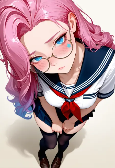 デフォルトの衣装: ヘアクリップ, 星形の顔の模様, 胸元, フリルの短い袖, 紫のドレス, 多色のドレス, 白い手袋, 茶色のベルト, 不対称な脚元の衣装, 外側のカラー, チャイニーズストッキング, 茶色の靴,