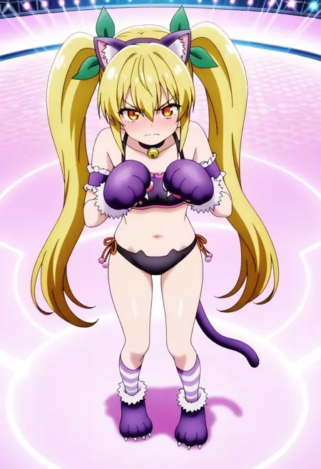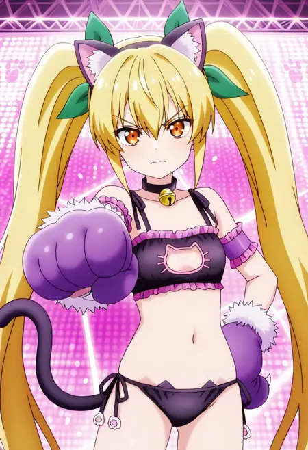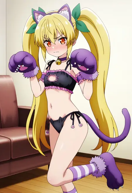 KannaNatsumiCat, 1girl, solo, 매우 긴 머리, 금발, 트윈테일, 눈 사이의 머리카락, 측면 머리카락, 주황색 눈, 송곳니, 작은 가슴, 녹색 머리 리본, 송곳니, 발톱 장갑, 가짜 고양이 귀, 목에 달린 종, 목걸이, 주황색 리본, 팔찌, 검은 브라, 검은 팬티, 고양이 란제리, 배꼽 노출, 줄무늬 양말, 발톱 신발, 고양이 꼬리,