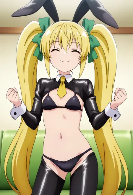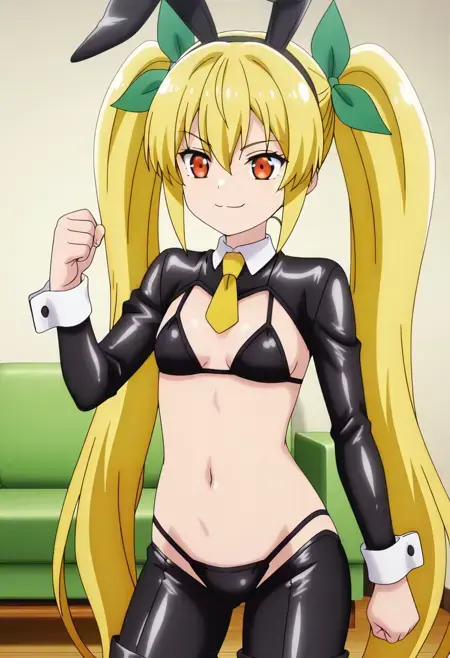 KannaNatsumiBunny, 1girl, solo, 매우 긴 머리, 금발, 트윈테일, 눈 사이의 머리카락, 측면 머리카락, 주황색 눈, 송곳니, 작은 가슴, 녹색 머리 리본, 송곳니, 가짜 검은 토끼 귀, 뒤집힌 복장, 뒤집힌 버니수트, 짧은 노란색 넥타이, 검은 비키니, 허벅지 길이 양말, 셔그(옷), 손목 커프, 검은 허벅지 길이 양말, 하이힐, 검은 허벅지 부츠,