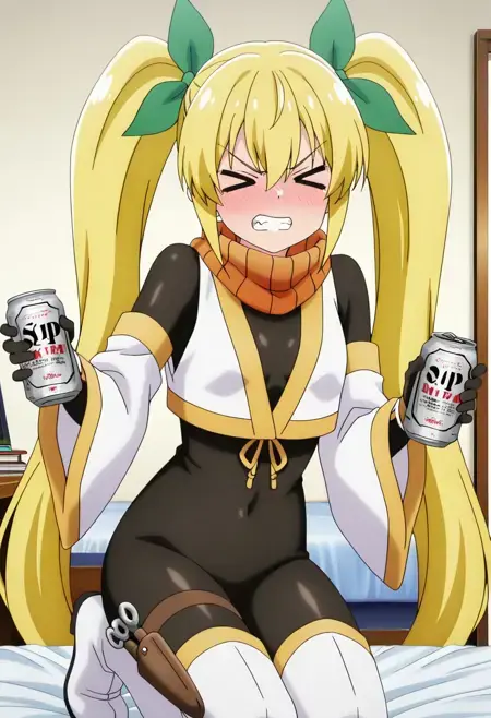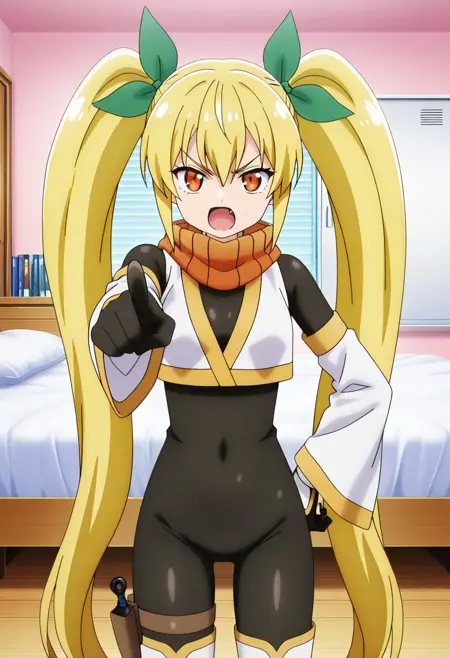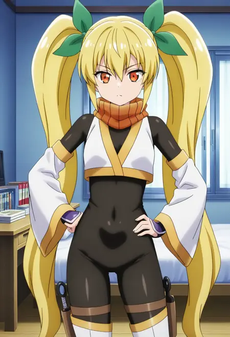 KannaNatsumiNinja, 1girl, solo, ninja, 매우 긴 머리, 금발, 트윈테일, 눈 사이의 머리카락, 측면 머리카락, 주황색 눈, 송곳니, 작은 가슴, 주황색 스카프, 장갑, 분리된 소매, 검은 바디슈트, 바디스톡킹, 흰색 베스트, 긴 소매, 검은 장갑, 팔 보호대, 흰색 넓은 소매, 녹색 머리 리본, 배꼽 가림, 앞쪽 리본, 허벅지 스트랩, 허벅지 쿠나이 홀스터, 쿠나이, 허벅지 길이 양말, 흰색 허벅지 부츠, 흰색 신발,