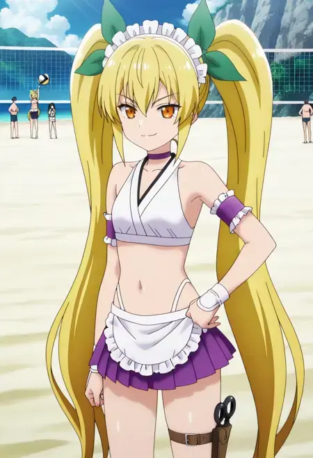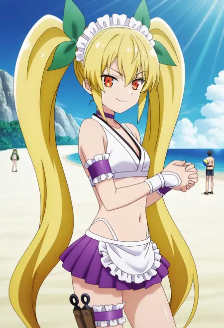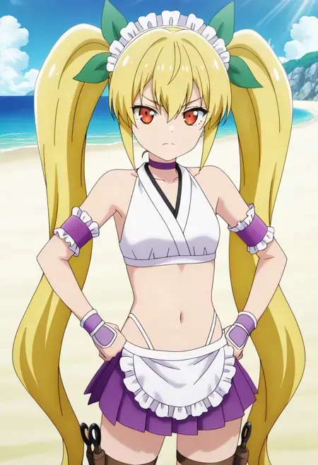 KannaNatsumiSwimsuit, 1girl, solo, 매우 긴 머리, 금발, 트윈테일, 눈 사이의 머리카락, 측면 머리카락, 주황색 눈, 송곳니, 작은 가슴, 녹색 머리 리본, 송곳니, 메이드 헤드기어, 흰색 비키니, 비키니 상의, 보라색 팔찌, 흰색 닌자 손목 커프, 메이드 앞치마, 프릴이 있는 흰색 앞치마, 허벅지 스트랩, 허벅지 쿠나이 홀스터, 쿠나이, 보라색 목걸이, 배꼽 노출, 보라색 주름 미니스커트, 흰색 프릴, 흰색 하이레그 팬티, 흰색 양말, 샌들,