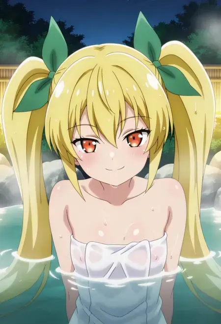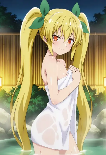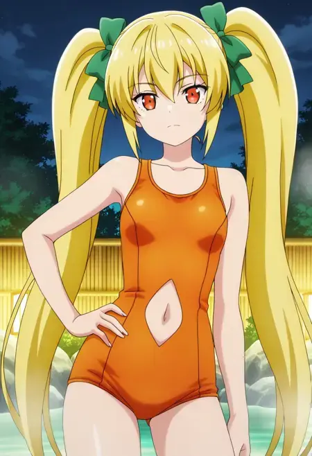 KannaNatsumiOnsen, 1girl, solo, 매우 긴 머리, 금발, 트윈테일, 눈 사이의 머리카락, 측면 머리카락, 주황색 눈, 송곳니, 작은 가슴, 녹색 머리 리본, 송곳니, 주황색 원피스 수영복, 견갑골, 배꼽, 배꼽 컷아웃, 맨발,