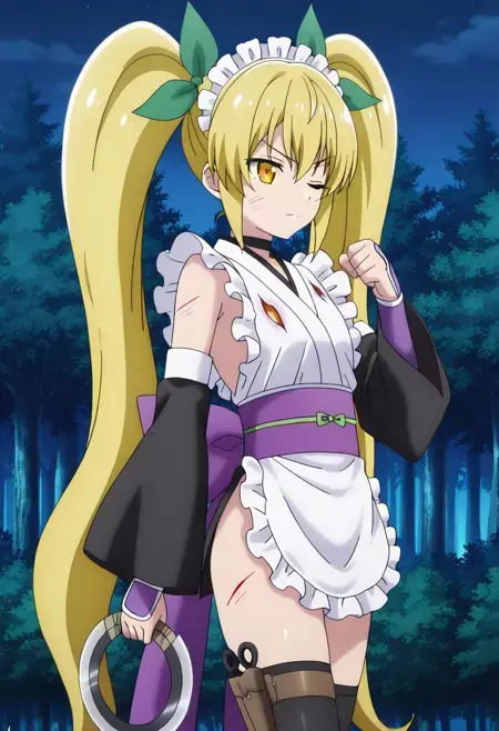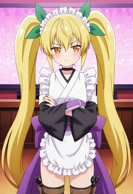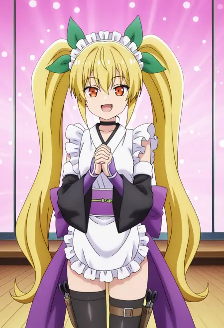 KannaNatsumiMaid, 1girl, solo, 매우 긴 머리, 금발, 트윈테일, 눈 사이의 머리카락, 측면 머리카락, 주황색 눈, 송곳니, 작은 가슴, 녹색 머리 리본, 송곳니, 목걸이, 메이드 헤드기어, 검은 허벅지 길이 양말, 메이드, 분리된 소매, 메이드 앞치마, 일본식 옷, 뒤쪽 큰 리본, 프릴, 허벅지 스트랩, 띠, 오비, 허벅지 스트랩, 허벅지 쿠나이 홀스터, 쿠나이,