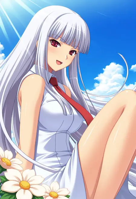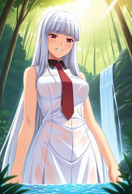 - mizuhoww, mature female, red eyes, slit pupils, white hair, very long hair, hime cut, blunt bangs, medium breasts,