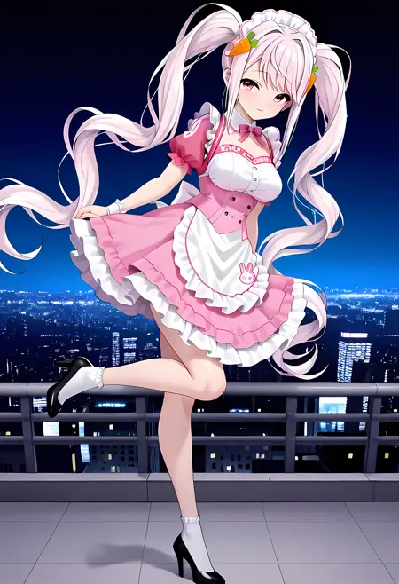 alice_Maid_cafe, 분홍색 머리, 긴 머리, 쌍머리, 음식 테마의 머리 장식, 머리 장식, 당근 머리 장식, 리본, 분홍색 눈, 가슴, 메이드 헤드기어, 메이드, 드레스, 앞치마, 흰색 팬티, 양말, 검은 신발, 하이힐,
