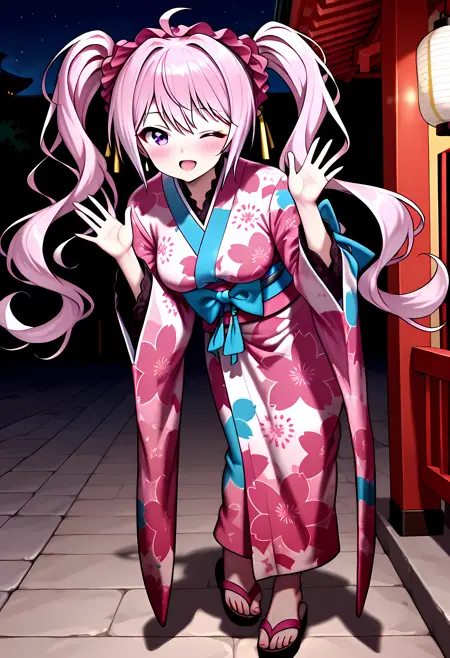 alice_kimono, 분홍색 머리, 긴 머리, 쌍머리, 보라색 눈, ahoge, 킴노, 분홍색 킴노, 일본 복장, 꽃무늬, 띠, 오비, 샌들,