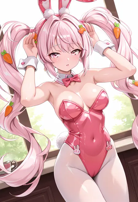 alice_Wonderful, 분홍색 머리, 긴 머리, 쌍머리, 동물 귀, 토끼 귀, 머리 장식, 음식 테마의 머리 장식, 리본, 가슴, 분리형 칼라, 플레이보이 버니, 레오타드, 스타킹, 흰색 스타킹, 꼬리, 넥타이,
