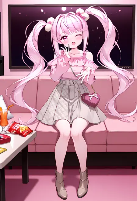 alice_casual, 분홍색 머리, 긴 머리, 쌍머리, 분홍색 눈, 분홍색 셔츠, 치마, 회색 치마, 발목 부츠, 가방,