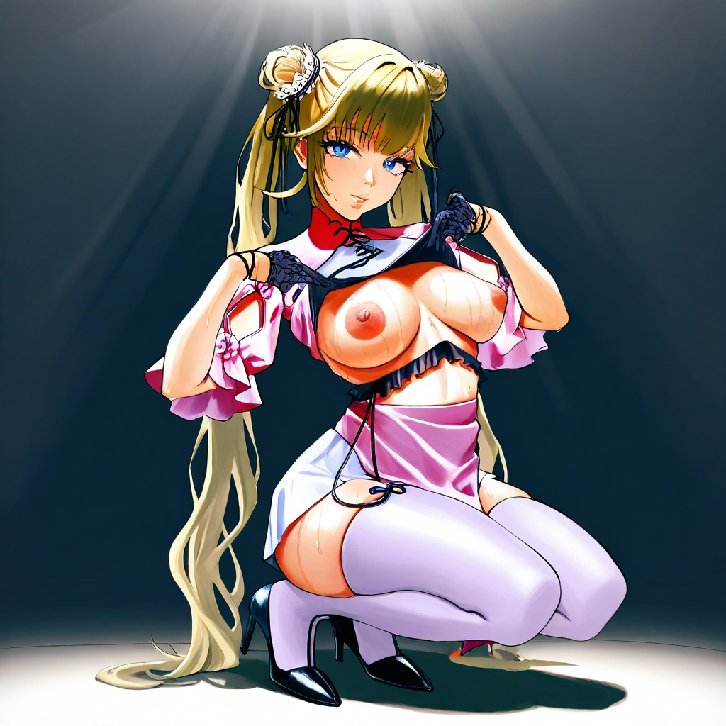 (VTuber_Hanabusa, outfit1, long hair, blonde hair, double bun, twintails, blue eyes, chinese clothes, gloves, thighhighs, high heels),