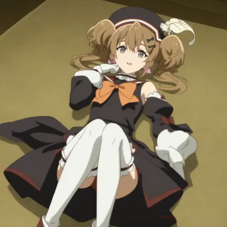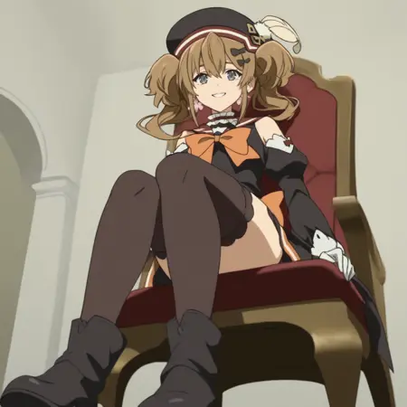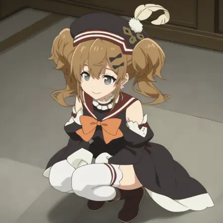 black beret, orange bowtie, bare shoulders, red sailor collar, frills, frilled collar, detached sleeves, black dress, hat feather, long sleeves, white gloves, puffy sleeves, thighhighs, boots,