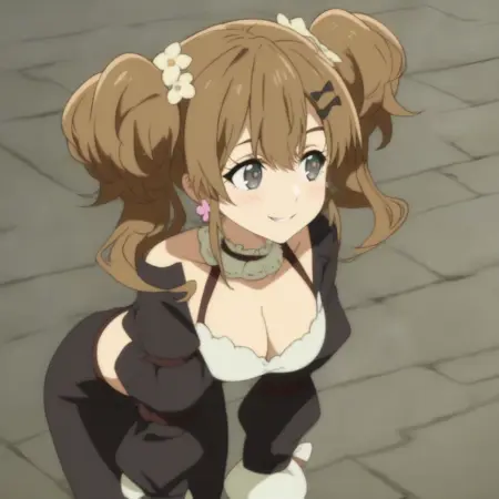 WMLynn, grey eyes, brown hair, long hair, twintails, sidelocks, jewelry, flower earrings, hair ornament, hairclip, black hair bow, hair between eyes,