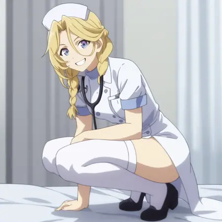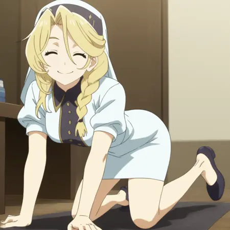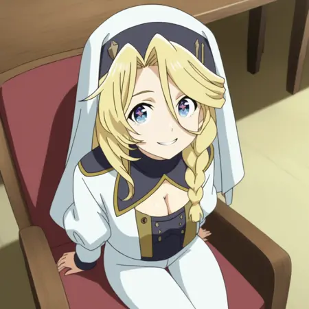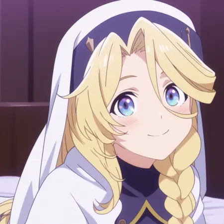 WMRihya、青い目、金髪、長い髪、修道服、片側の編み込み、肩にかかる髪、眉間の髪、分け目のある前髪