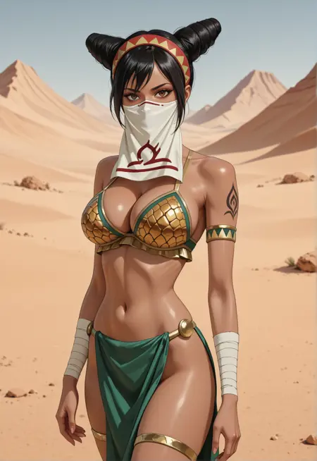 libraFT, dark skin, black hair, short hair, hairband, double bun, brown eyes, mouth veil, bare shoulders, tattoo, bandages, armband, cleavage, large breasts, midriff, bikini, green pelvic curtain, sandals,