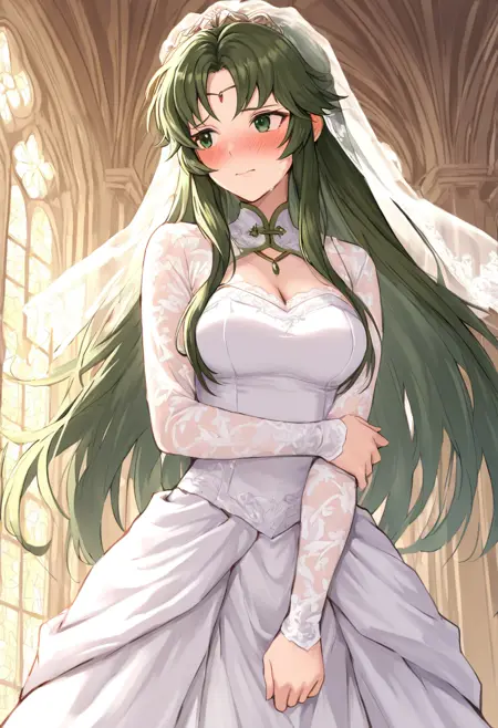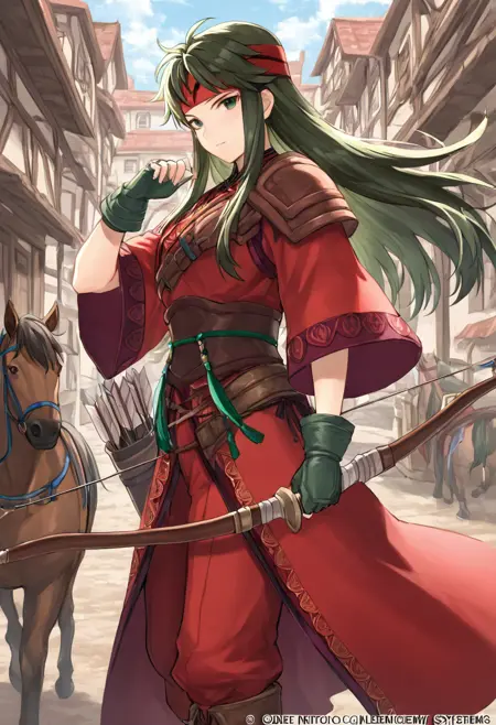 トリガー単語: SueFE、長い髪、濃い緑の髪、緑の目、赤いヘアバンド、肩の鎧、赤いローブ、短い袖、指なし手袋、緑の手袋、腰帯、茶色の腰帯、ロープベルト、矢筒、赤いパンツ、茶色のブーツ、