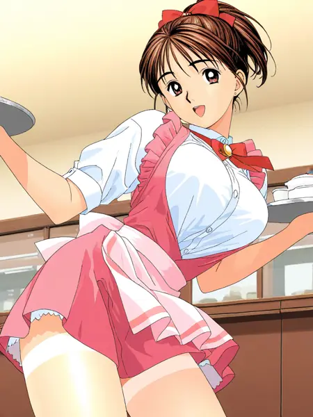웨이트리스, 흰색 분홍 치마, 프릴, 빨간 리본, 노란 액세서리, 투명한 팬티스타킹,