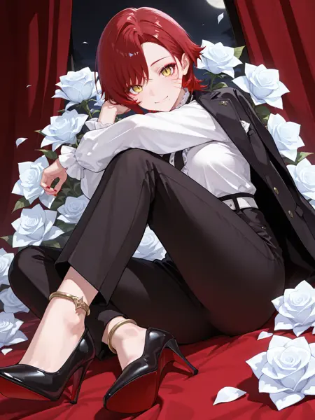 white shirt, white rose, frills, puffy sleeves, black jacket, jacket on shoulder, red nails, white belt, black high-waist pants, ankle rings, black footwear, high heels,