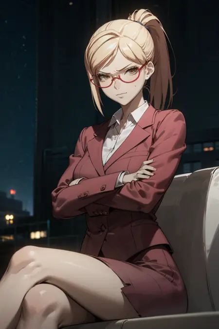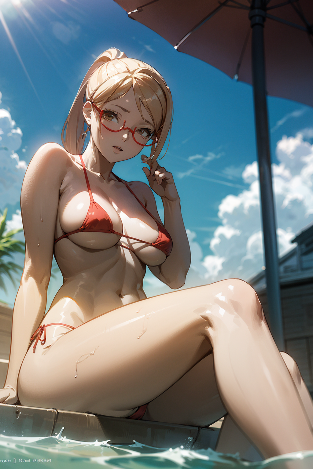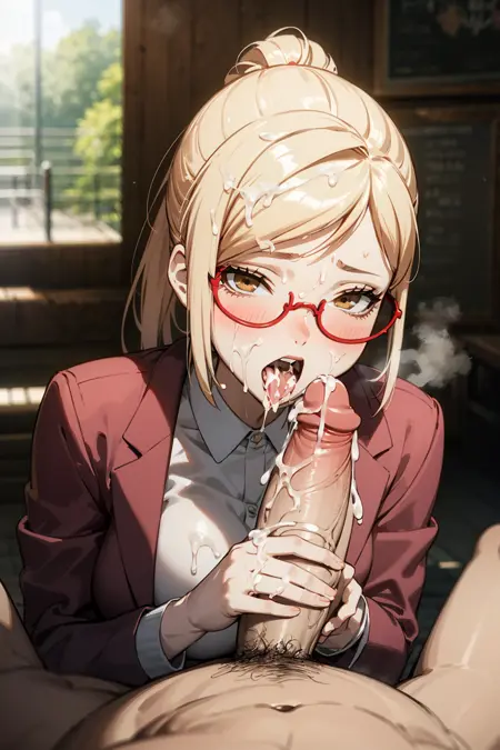 Akiyama_K,1 girl, solo, swept bang, ponytail, blonde hair, red glasses, large breasts
