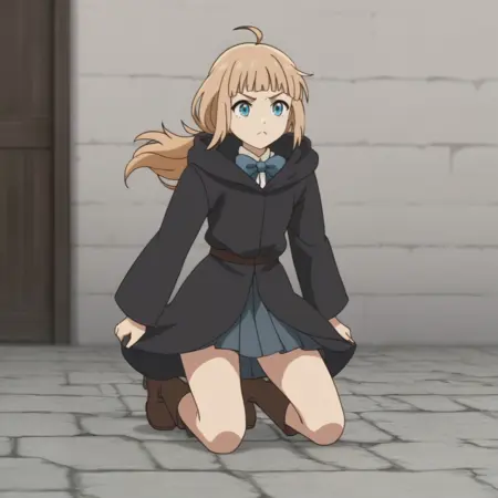 파란 리본 넥타이, 후드 내려짐, 검은 로브, 치마, 긴 소매, 갈색 부츠,