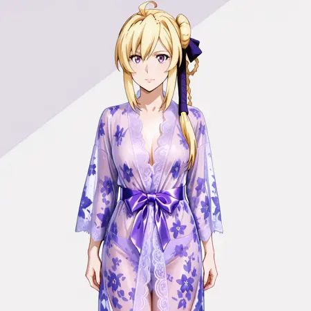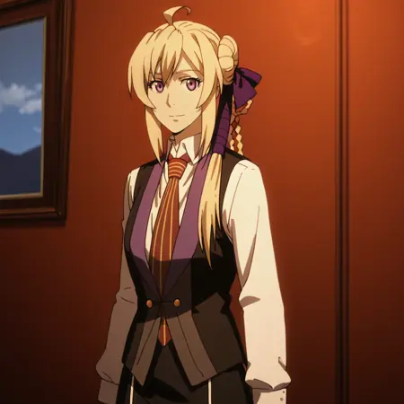穿白色夹克的触发词:SilucaWhiteJacket, 1girl, 金发, 紫色眼睛, 截图, 长发, 辫子, 紫色丝带, 腰带, 发带, 锁骨, 小披肩, 白色长裤, 长袖, 衬衫, 裙子, 蝴蝶结, 第三方编辑, 蓝色丝带, 牛仔镜头