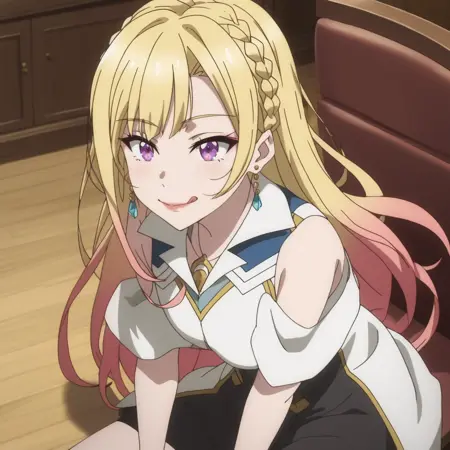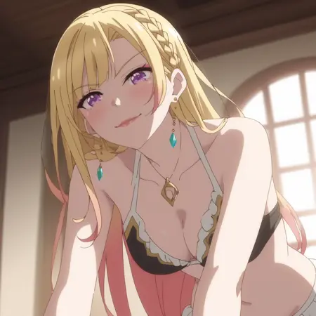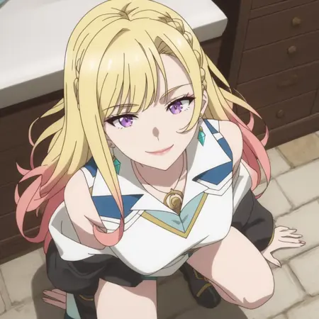 SRAMerlin, 금발, 보라색 눈, 긴 머리, 보석, 귀걸이, 땋은 머리, 다색 머리, 그라데이션 머리, 분홍색 머리, 왕관 땋기,