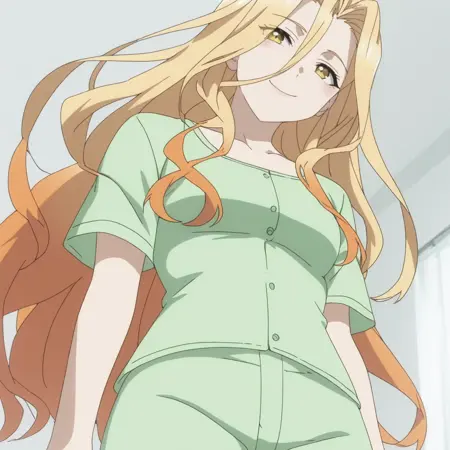 SilviePajamas、パジャマ、緑のシャツ、鎖骨、緑のショートパンツ、短い袖