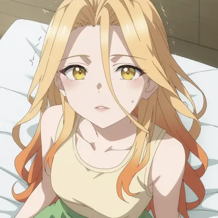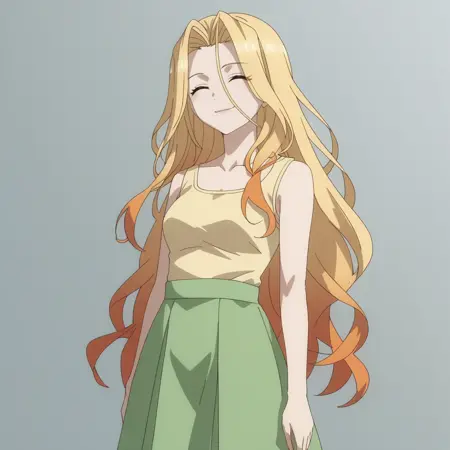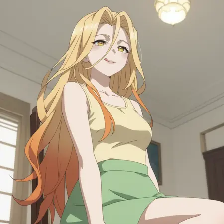 SilvieSkirt、黄色のシャツ、緑のスカート、鎖骨、ノースリーブ