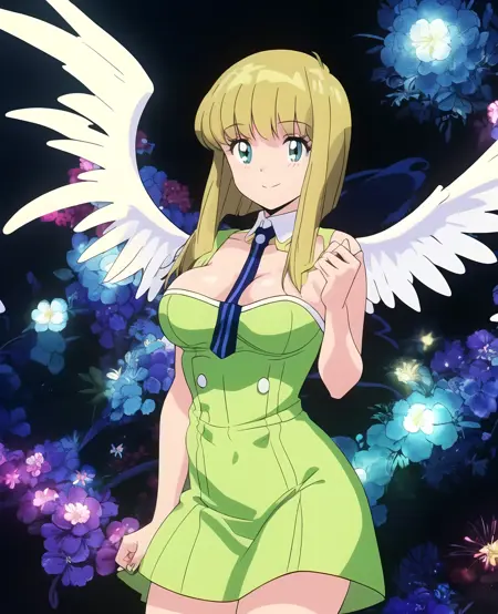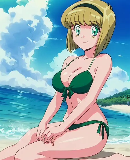 (Hosokawa Miki:1.4), (Green eyes:1.4),bangs, medium breasts, strong yellow hair,(short hair:1.4)