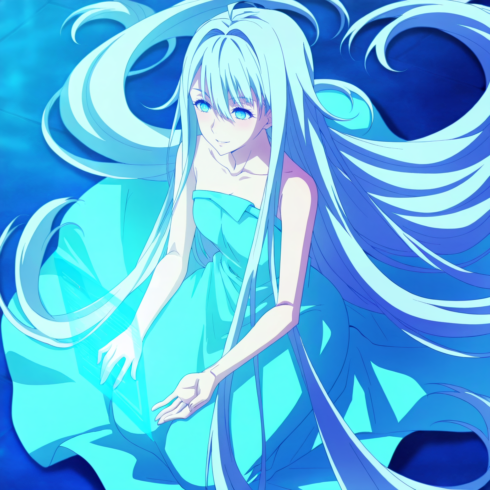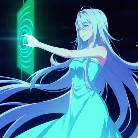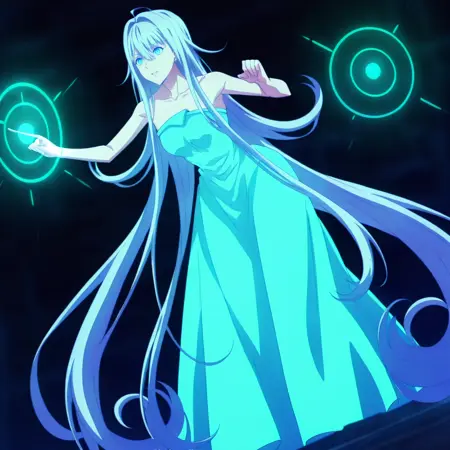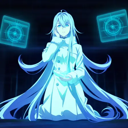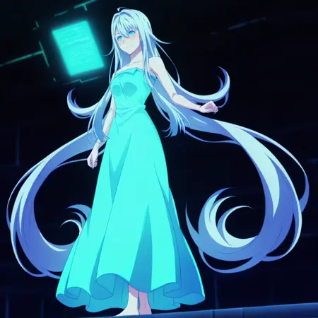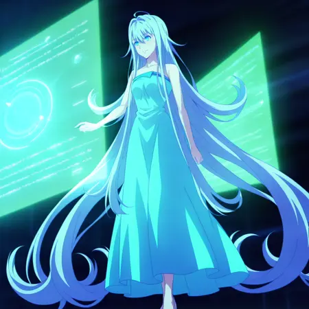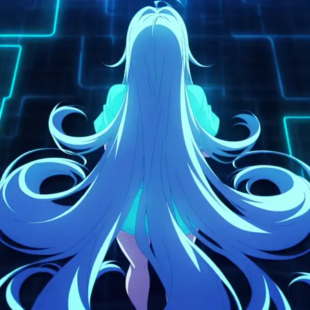 DRNorma, hologram, blue eyes, blue hair, absurdly long hair, hair between eyes,