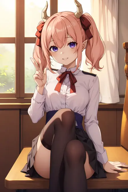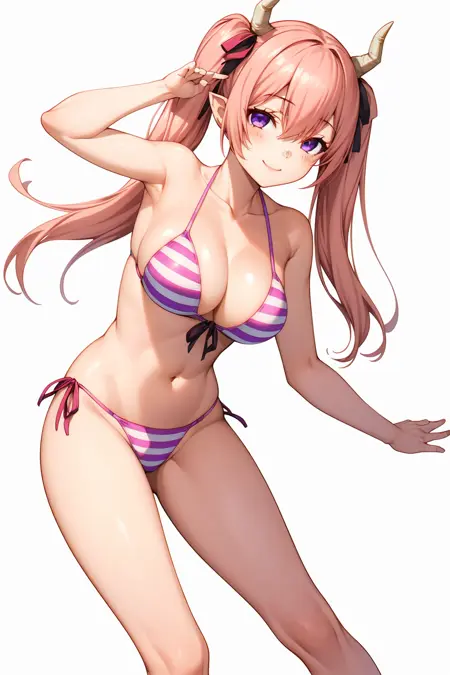 lineye,1girl,solo,짧은 트윈테일,눈 사이의 머리카락,분홍색 머리,중간 길이 머리,악마 뿔,진한 빨강 머리 리본,뾰족한 귀,보라색 눈