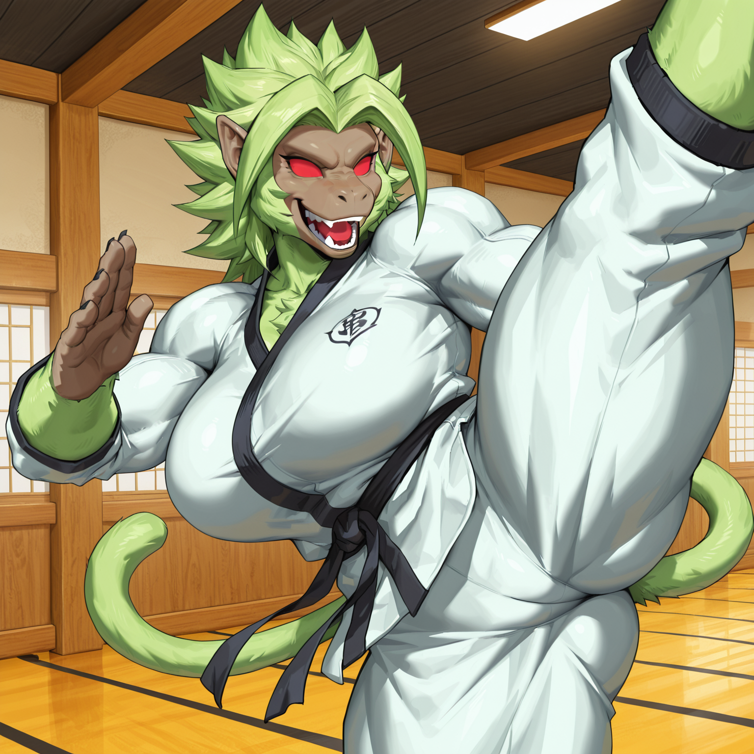 正向提示词:BLGA,毛茸茸的男性,人形动物,灵长类,猴子,浅绿色头发,刺状头发,中等长度头发,尖耳朵,红色巩膜,无瞳孔,浅绿色身体,浅绿色毛发,浅绿色尾巴,猴子尾巴,中等长度尾巴,肌肉发达的男性,腹肌
