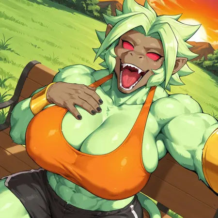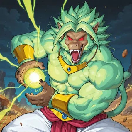 来自《龙珠英雄》的布鲁伊在大猿形态下的形象。可用于训练的图像很少,因此不要对牙齿和耳环等细节抱有太高期望,尤其是耳环总是无法正确生成,除非你愿意尝试,否则不建议生成耳环。至少角色的整体外观会比较准确,但可能会出现一些不良的伪影问题。将权重降低0.1或0.2有助于改善,但会略微改变他的服装。有时还会尝试在眼睛周围生成反光或白色光点。