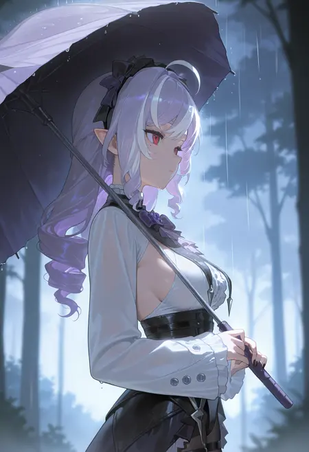 그녀의 외모 태그: 1girl, solo, long hair, medium breasts, red eyes, purple hair, drill hair, black nails, sidelocks, mole under eye, fingernails, two-toned hair, streaked hair, ahoge, white hair, twin drills, drill sidelocks, pointy ears,
