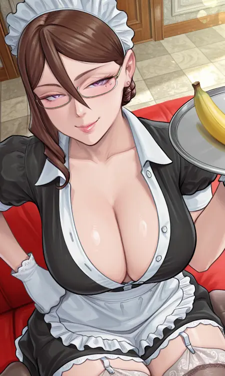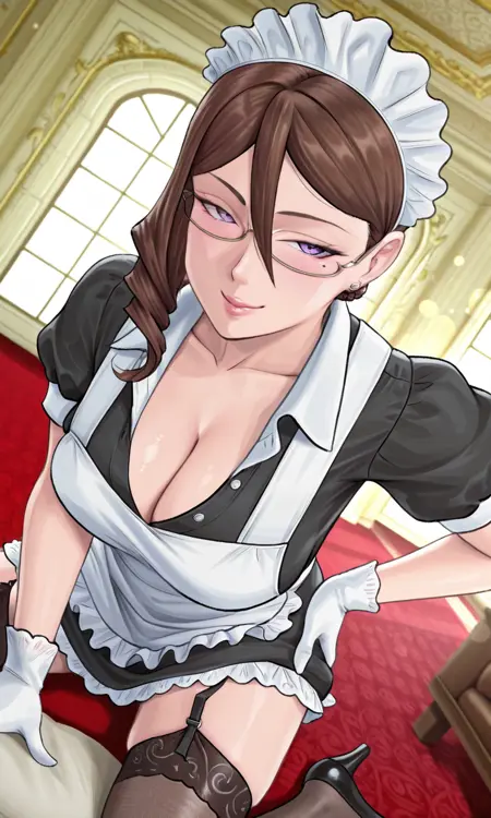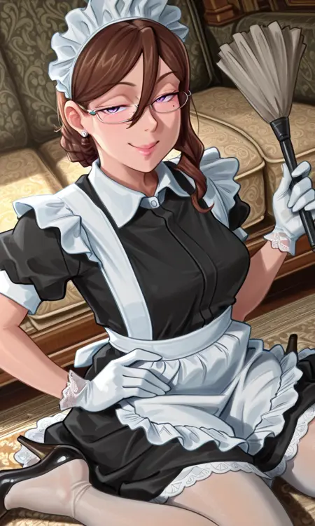 victoriark, 紫色眼睛, 眼下痣, 痣, 棕色头发, 发丝垂于眼间, 发型1, 钻石发型, 单发髻, 发髻, 眼镜, 半框眼镜, 耳环, 女仆, 女仆头饰, 黑色连衣裙, 带领子的连衣裙, 荷叶边围裙, 白色围裙, 女仆围裙, 腰部围裙, 蓬松短袖, 白色手套, 白色连裤袜, 白色连裤袜, 替代服装,