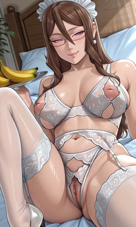 victoriark, 紫色眼睛, 眼下痣, 痣, 棕色头发, 发丝垂于眼间, 发型2, 侧发, 长发, 眼镜, 半框眼镜, 肚脐, 耳环, 女仆头饰, 内衣, 文胸, 无罩杯文胸, 无乳头衣物, 白色文胸, 乳头镂空, 吊袜带, 白色过膝袜, 白色内裤, 裆部镂空, 无裆内裤, 白色鞋履, 大乳房, 乳头, 阴部, 女性阴毛, 阴毛, 倒置乳头, 乳头,