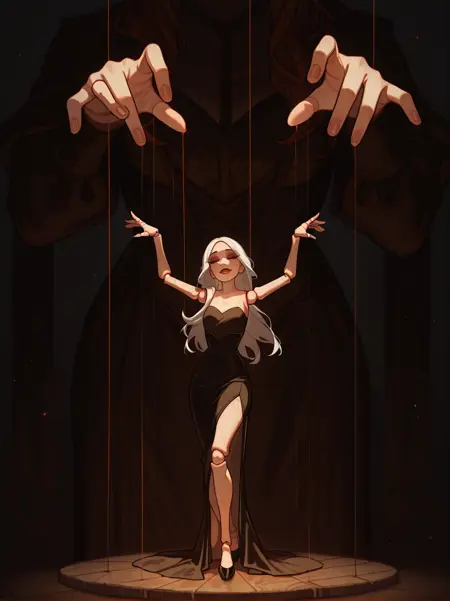 木偶师概念提示词: "木偶师、巨手、巨女"