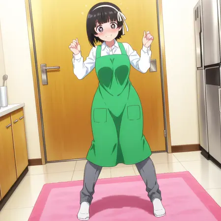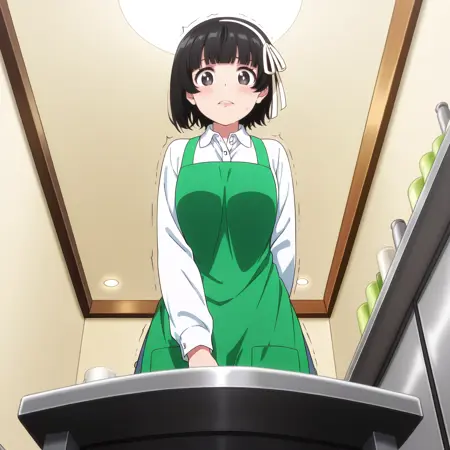 ArisaApron, white shirt, long sleeves, collared shirt, skirt, green apron, suspenders,