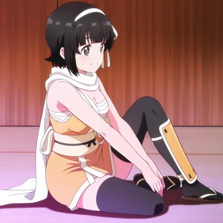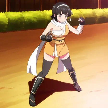 ArisaNinja, scarf, white scarf, sarashi, japanese clothes, bandages, thighhighs, black legwear, sleeveless, bare shoulders, cleavage, ninja, sash,