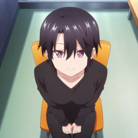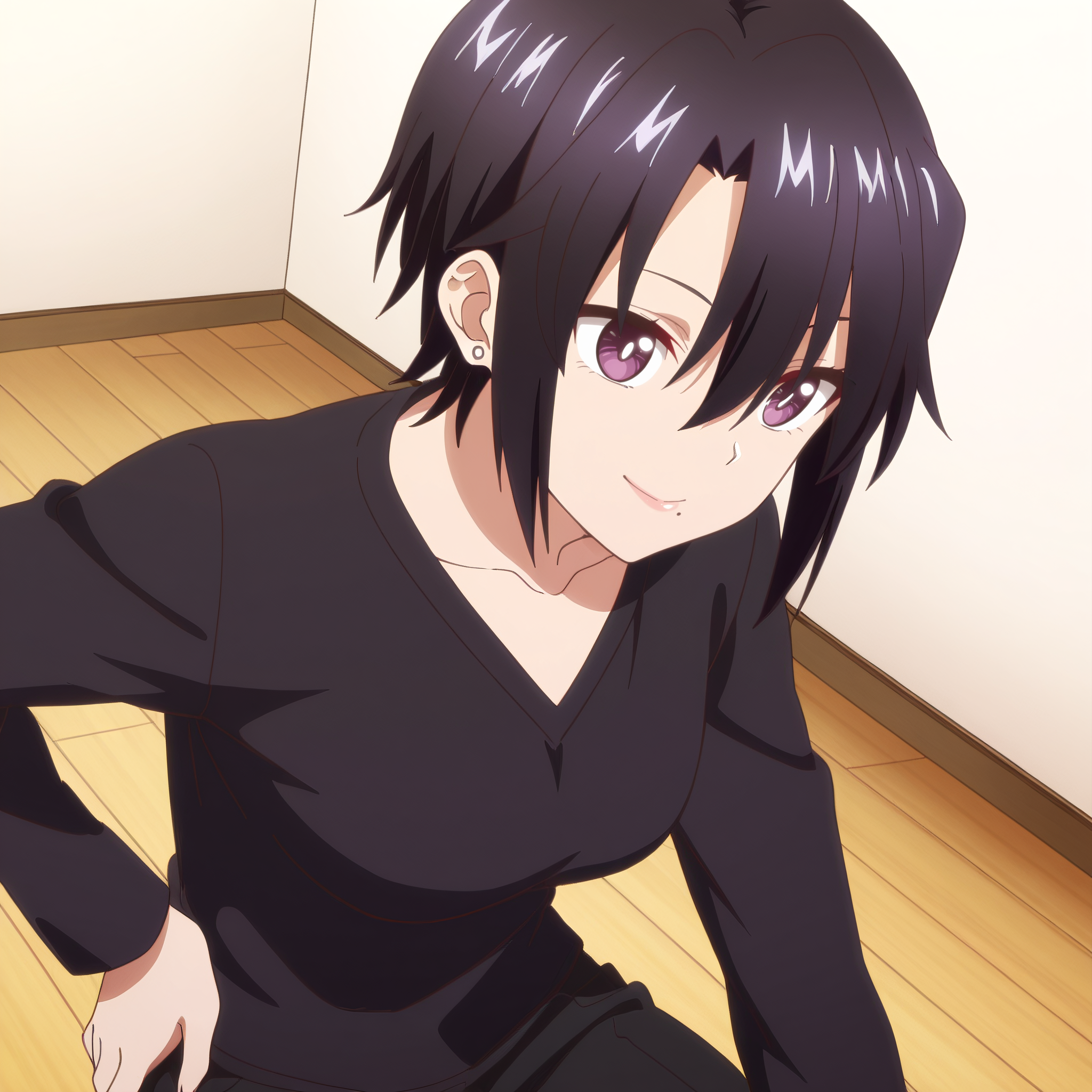 ANAKuro、黒髪、ショートヘア、紫の目、目の間の髪、前髪、イヤリング、髪の間から見える眉毛、ピアス、