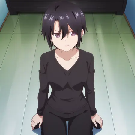 KuroShirt、黒シャツ、鎖骨、長袖、黒ズボン、