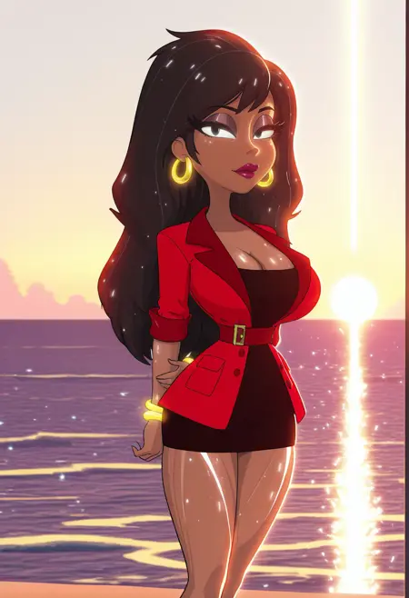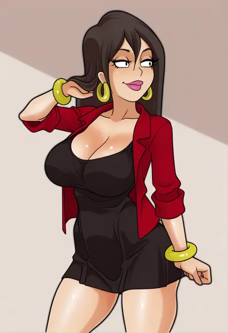 주요 복장: 빨간 재킷, 드레스, 검은 드레스, 가슴 노출, 팔찌, 후프 귀걸이, 빨간 신발, 하이힐, 목걸이,