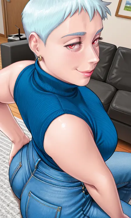 kristelark, mature female, wrinkles, aged up, old, wrinkled skin, short hair, very short hair, aqua hair, blue hair, white hair, plump, lips, red eyes, blue sweater, earrings, turtleneck, sleeveless, sleeveless turtleneck, blue jeans, denim,