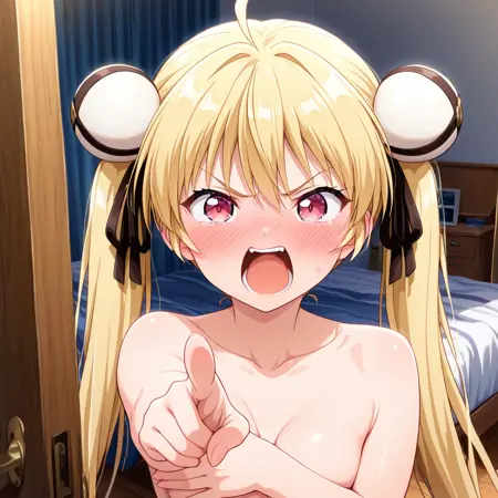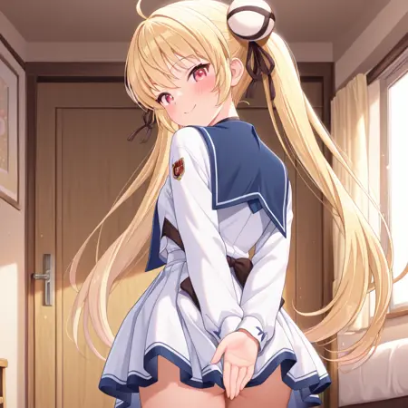 トリガーワードと推奨プロンプト:yuimachiguruil、赤い目、ツインテール、金髪、あほ毛、学校制服、黒いタイツ、茶色のブーツ