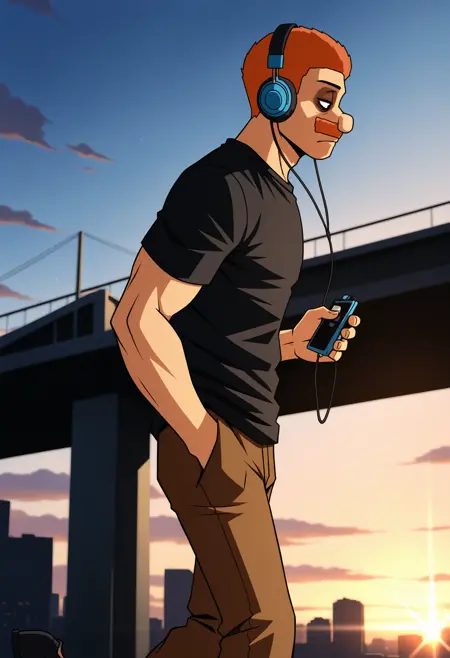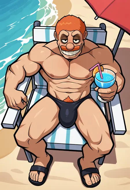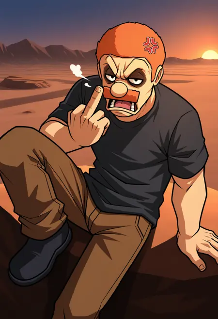 1boy, detg, orange hair, bags under eyes, mustache, black eyes, orange mustache, facial hair