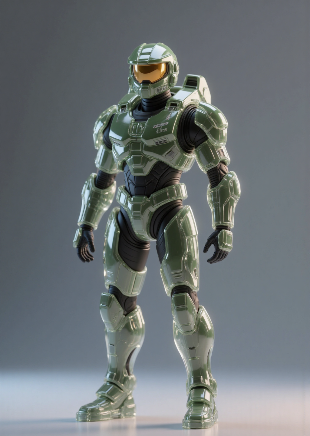 BTM, master chief, HALO, 사실적인 영화 캐릭터, 전체 신체, 캐릭터 외관에 반사 효과가 있는 반투명 재질 층, 밝은 배경,